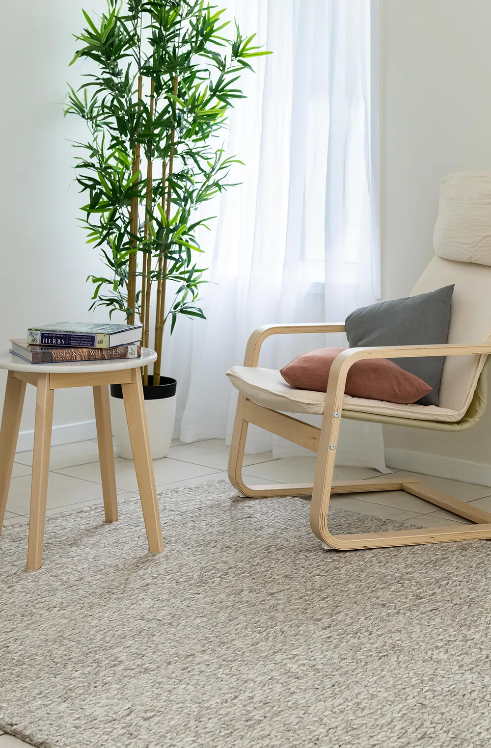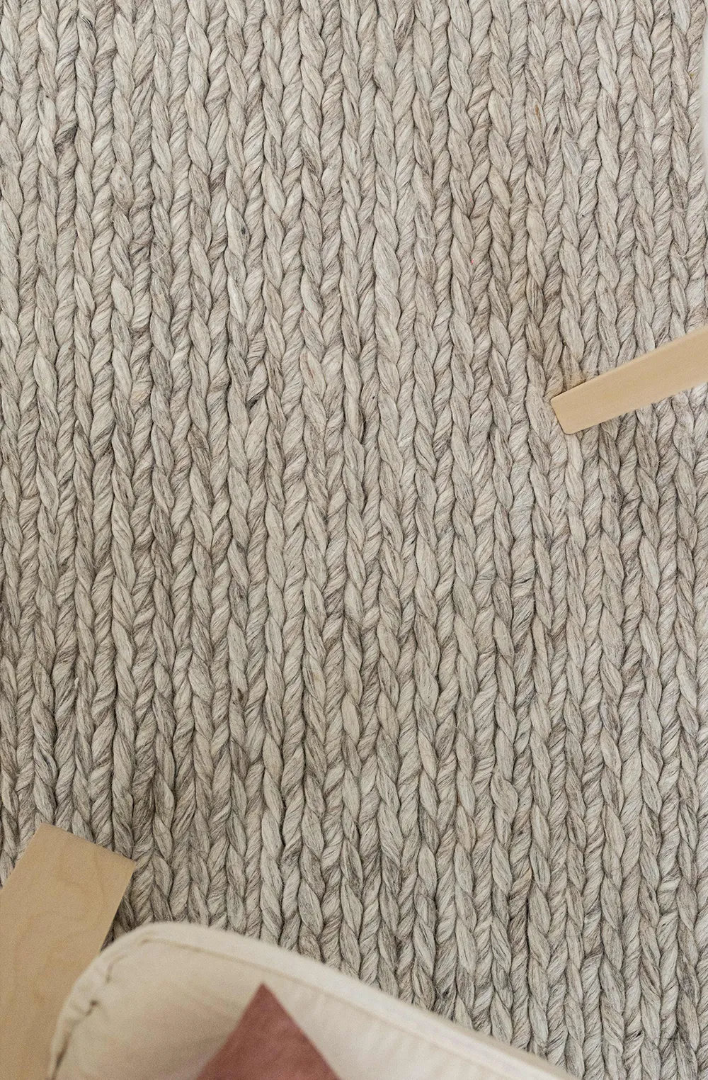 Exceptionally chunky wool yarns with a rich texture that approaches woven art. The handwoven braiding showcases the wool’s distinctive qualities, the washed yarns offering generous softness underfoot. Natural variations in the wool make each rug unique.